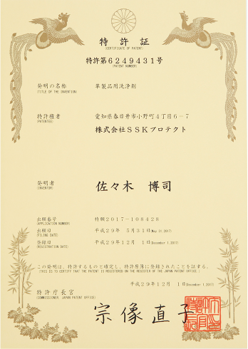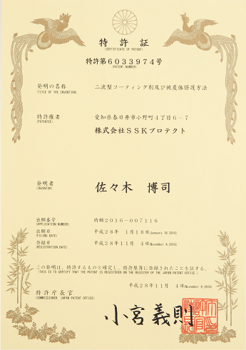 この「SSK保護理論」のもと、12年にわたる研究・実証と試行錯誤の末に確立したのが、弊社の独自技術「二液型被覆体保護方法(特許取得2016-007116)」です。これにより、軟性素材に対して高い防汚性・保護力を長期間持続でき、しかも従来の有機溶剤を使ったコーティングよりもはるかに安全なコーティング剤を作り出すことに成功しました。