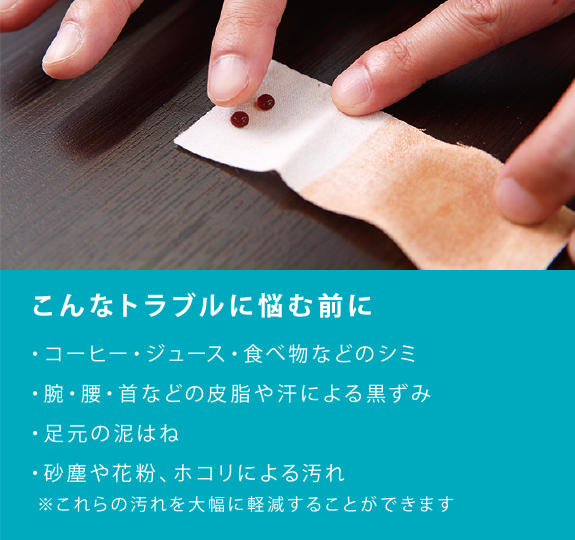 防汚能力と衝撃吸収力を兼ね備え、汚れはもちろん摩擦や細菌からも強力に保護します。