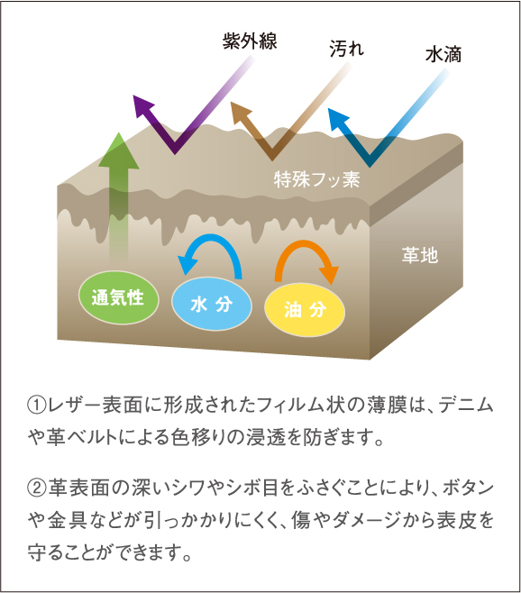 革や布地などの柔らかい素材に被膜が追従する、まったく新しいコーティングです。